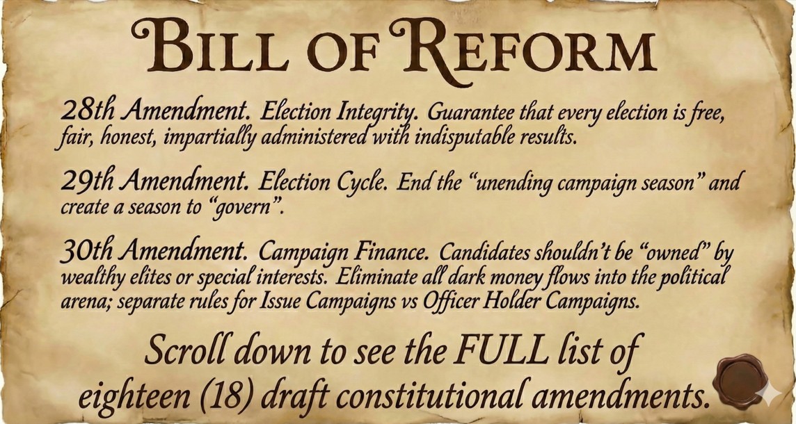 - The Mission: We need a new generation of Patriots to draft a comprehensive Bill of Reform—a set of procedural “Design Changes” meant to engineer corruption “out” of the system and responsiveness to the Citizens “in”.